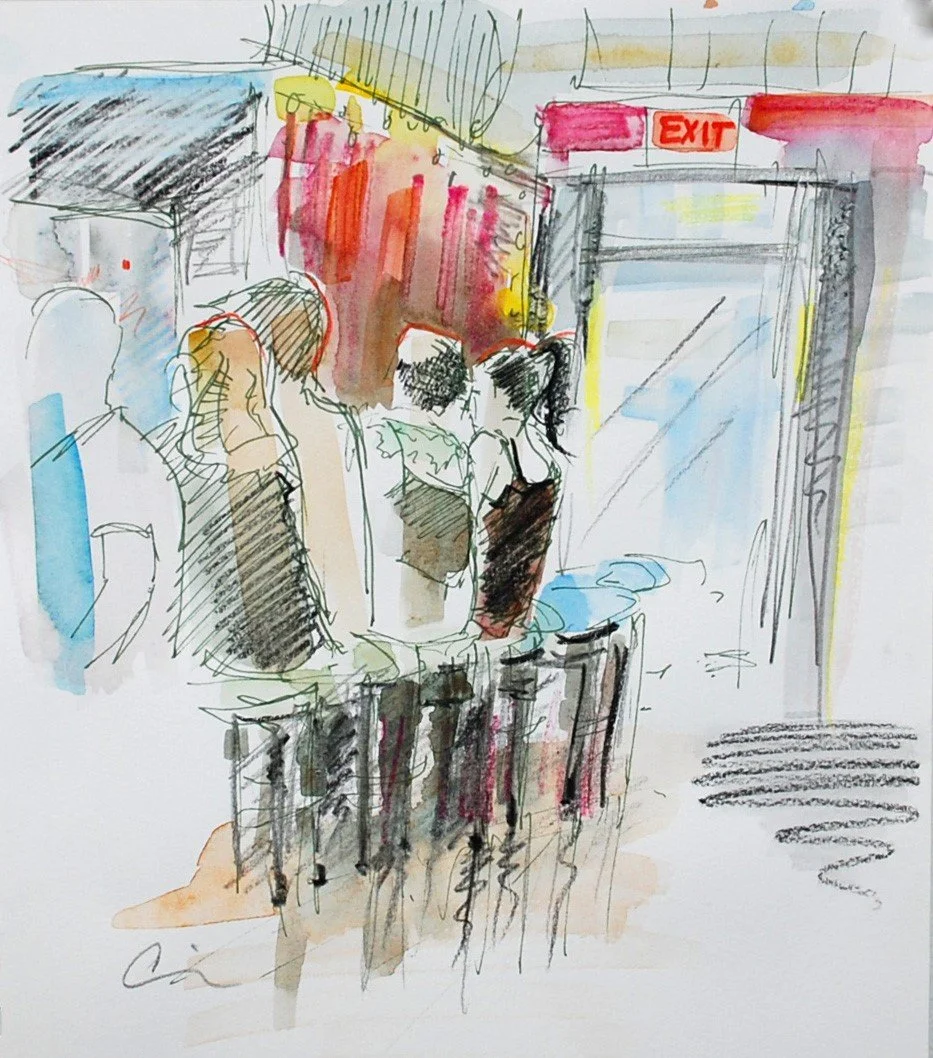 Spacebar sketch, 7 x 10 “, Pen, Watercolor, Charcoal, and Watercolor Pencil